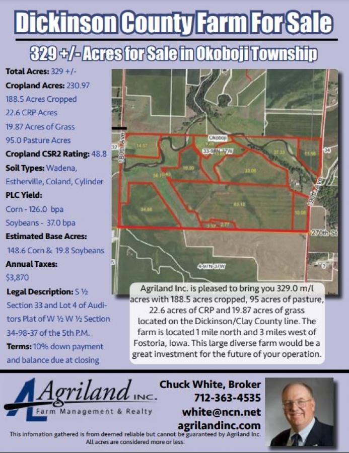 Agriland Inc. is pleased to bring you 329.0 m/l acres just north of the Clay & Dickinson county line. The farm has 188.5 acres cropped, 95 acres of pasture, 22.6 acres of CRP and 19.87 acres of grass. The farm is located 1 mile north and 3 miles west of Fostoria, Iowa. This large diverse farm would be a great investment for the future of your operation.