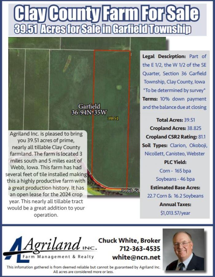 Agriland Inc. is pleased to bring you 39.51 acres of prime, nearly all tillable Clay County farmland. The farm is located 3 miles south and 5 miles east of Webb, Iowa. This farm has had several feet of tile installed making this a highly productive farm with a great production history. It has an open lease for the 2024 crop year. This nearly all tillable tract would be a great addition to your operation.