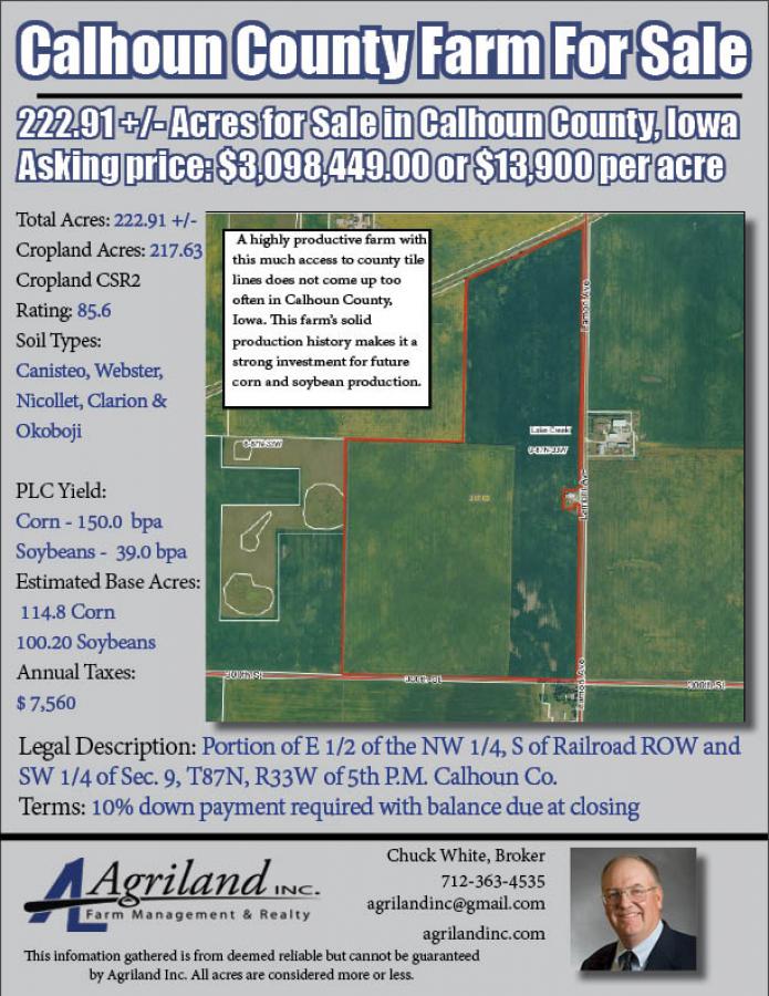 Agriland Inc. is pleased to bring you 222.91 m/l acres in Lake Creek Township Calhoun County, Iowa. The farm is located 2.5 miles West and 2 miles South of Rockwell City, Iowa. This farm has a strong production history and an average CSR2 rating of 85.6. It also features many county tile lines running through it ensuring for adequate drainage.
